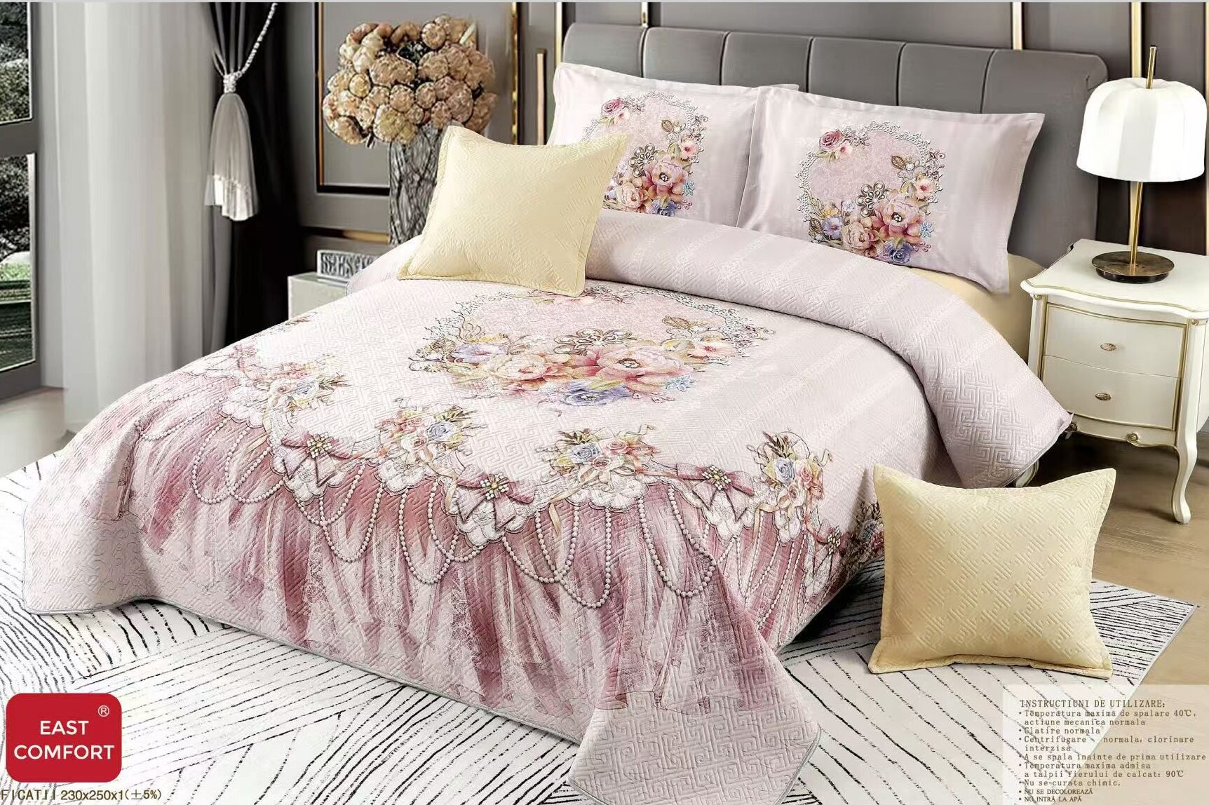 Set Cuvertura de Pat, matlasata, din catifea + 4 fete de perna. Cuvertura din catifea matlasata adaugă mai multă căldura si eleganta dormitorului tău.