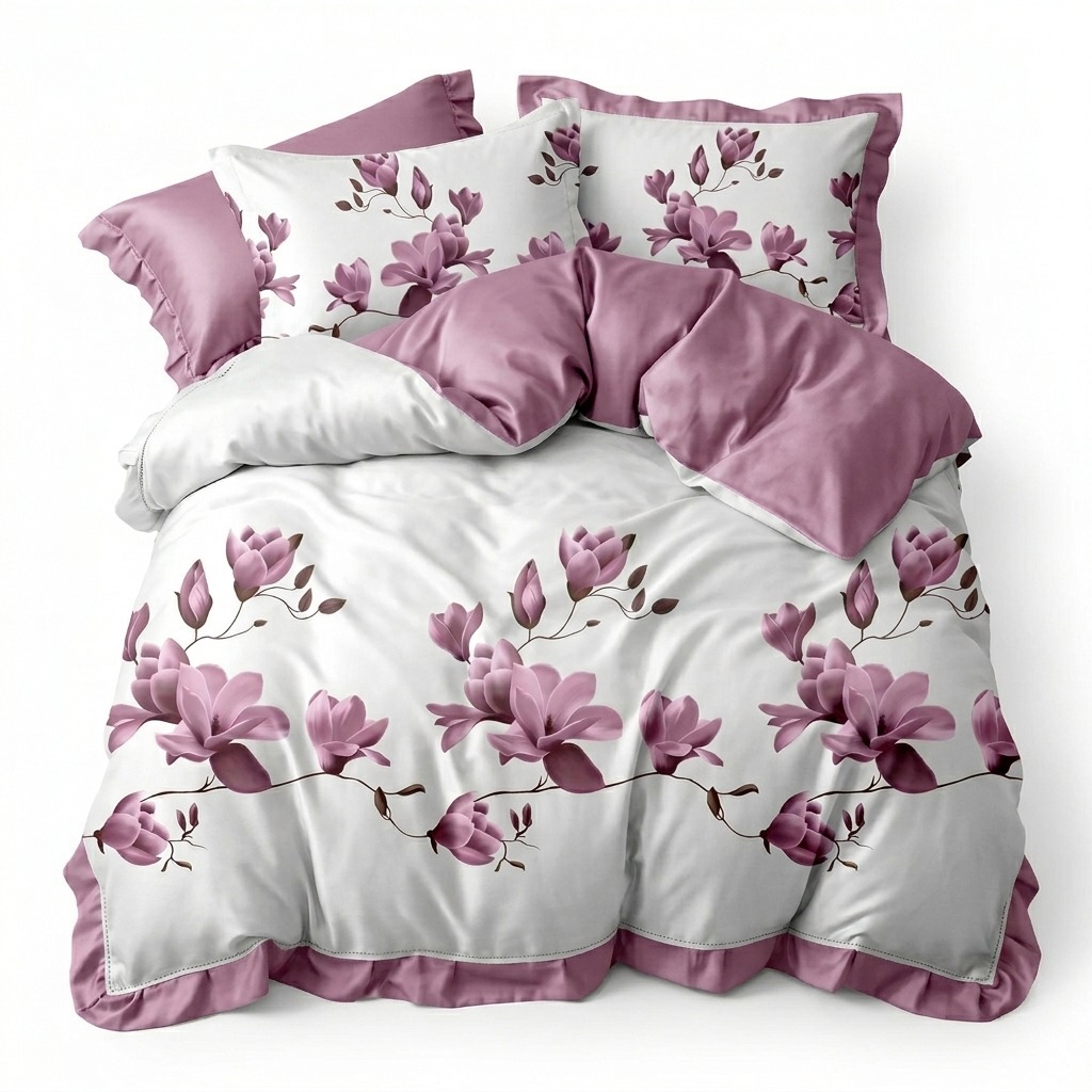 Lenjerie de pat bumbac finet 6 piese, modelul Magnolie Roz, aduce delicatețea grădinilor înflorite direct în spațiul tău de odihnă. Realizat dintr-un bumbac tratat pentru o moliciune supremă, acest set complet asigură un confort termic ideal și o rezistență sporită, fiind alegerea perfectă pentru a crea o atmosferă romantică și relaxantă în fiecare seară.