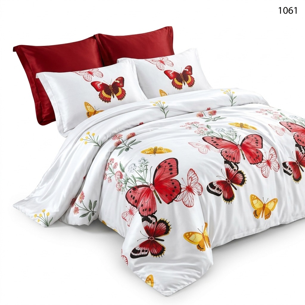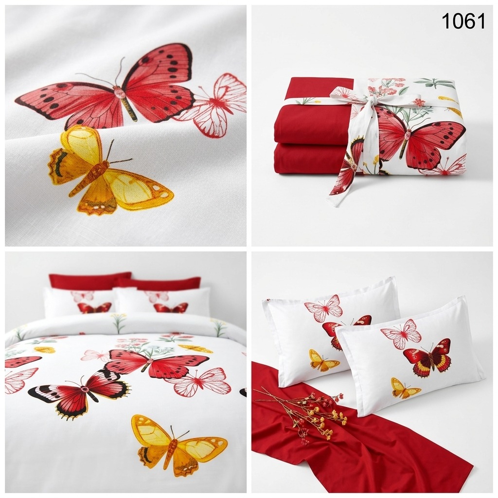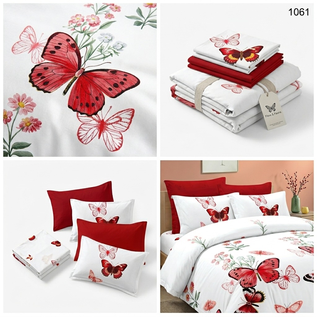Estetica este dominată de un imprimeu magnific cu fluturi mari în nuanțe de roșu pasional și galben solar, pe un fundal alb imaculat. Această compoziție este echilibrată spectaculos de un cearșaf de pat și fețe de pernă secundare uni, într-o nuanță profundă de roșu carmin.
