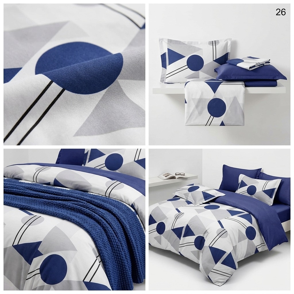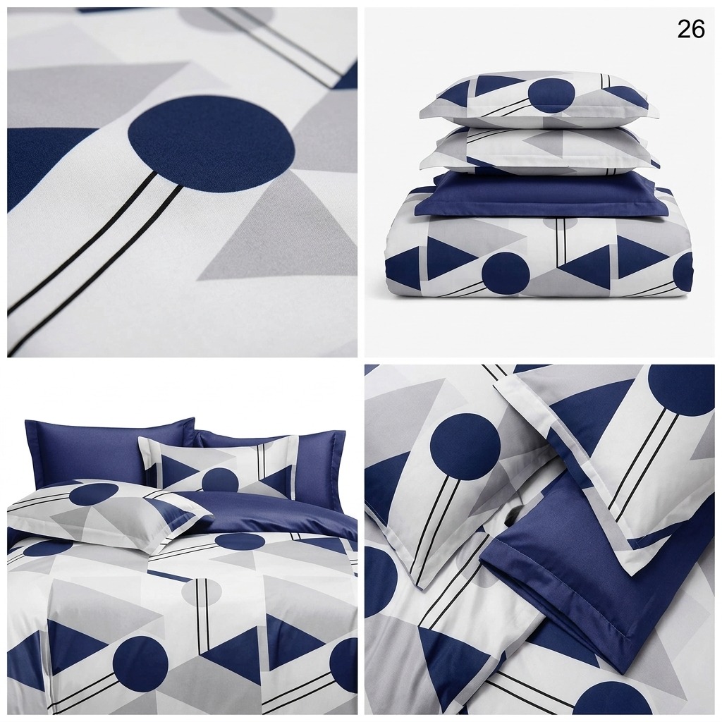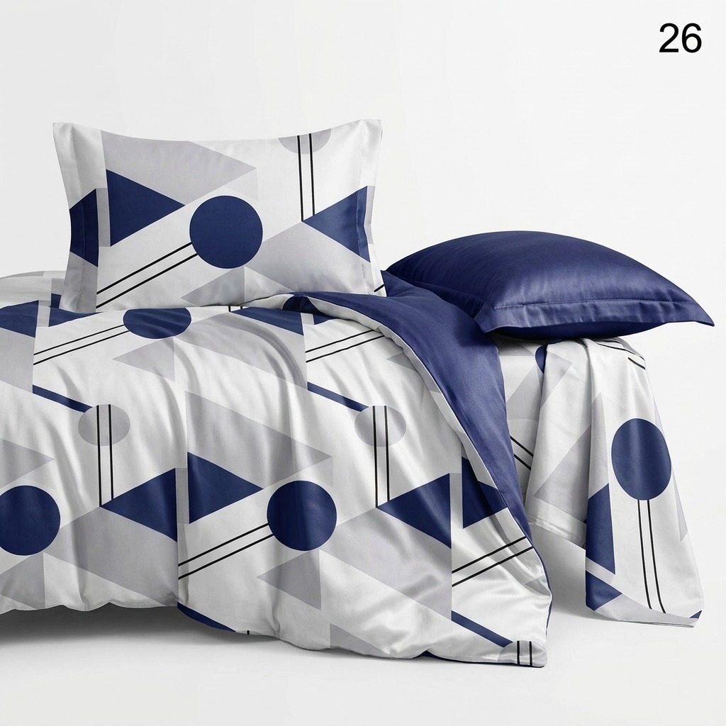 Estetica este dominată de un imprimeu curajos cu cercuri, triunghiuri și linii în nuanțe de bleumarin și gri, pe un fundal luminos. Această compoziție este echilibrată spectaculos de un cearșaf de pat și fețe de pernă uni, într-o nuanță profundă de albastru marin.