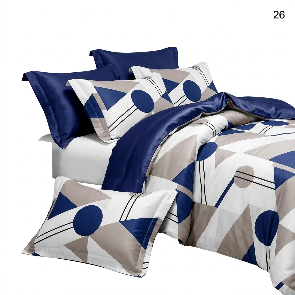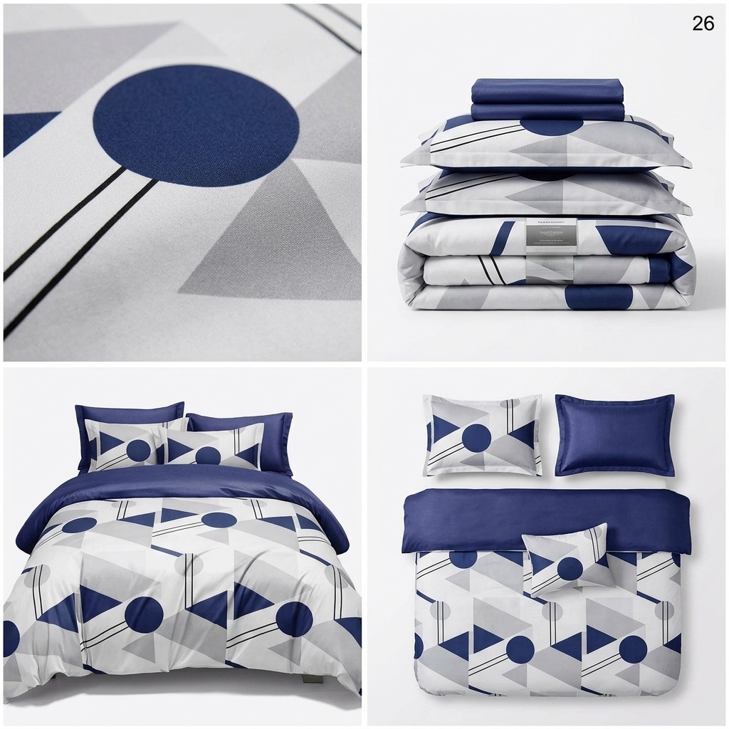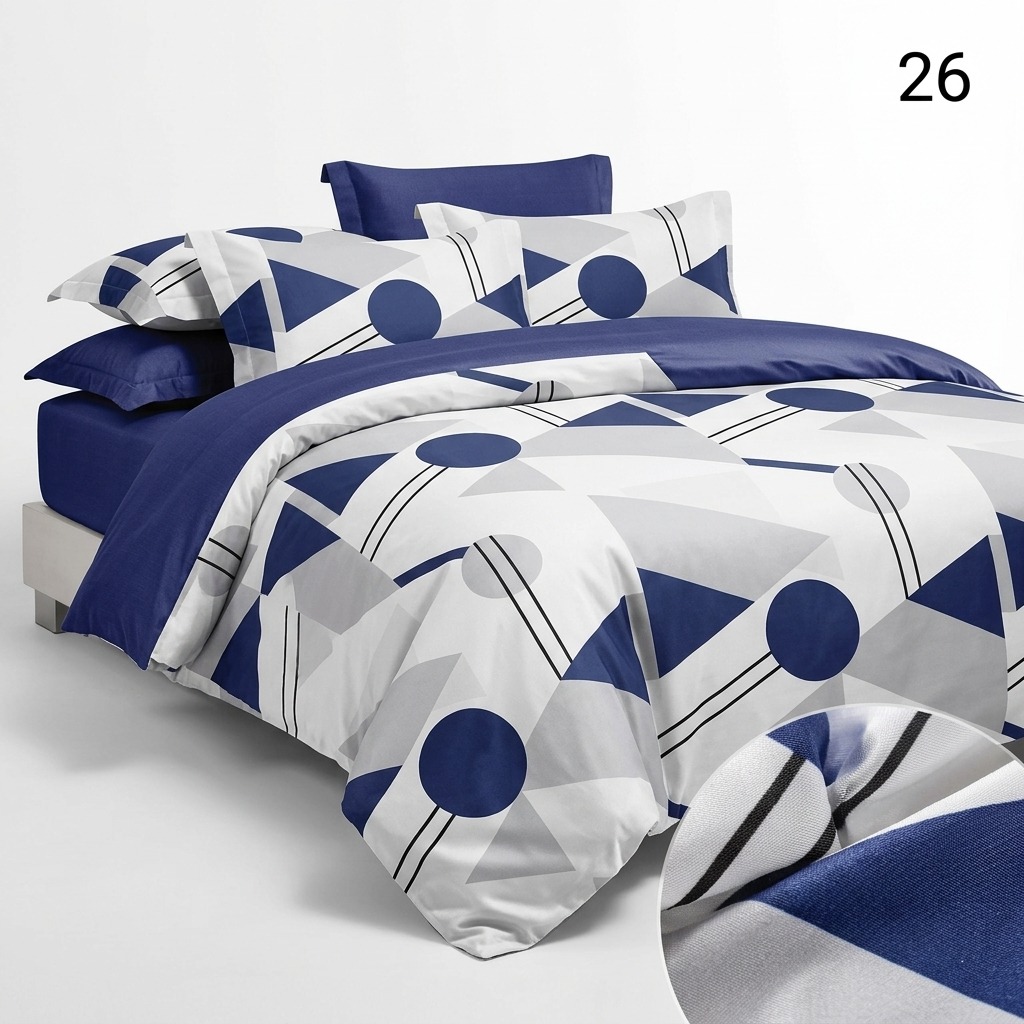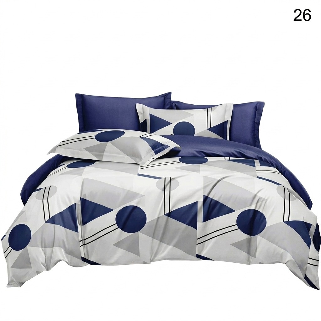 Estetica este dominată de un imprimeu curajos cu cercuri, triunghiuri și linii în nuanțe de bleumarin și gri, pe un fundal luminos. Această compoziție este echilibrată spectaculos de un cearșaf de pat și fețe de pernă uni, într-o nuanță profundă de albastru marin.