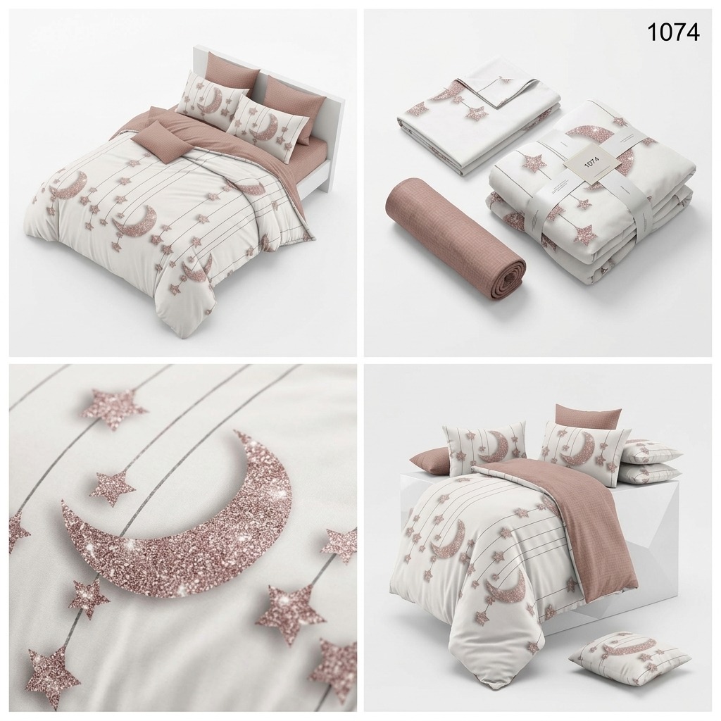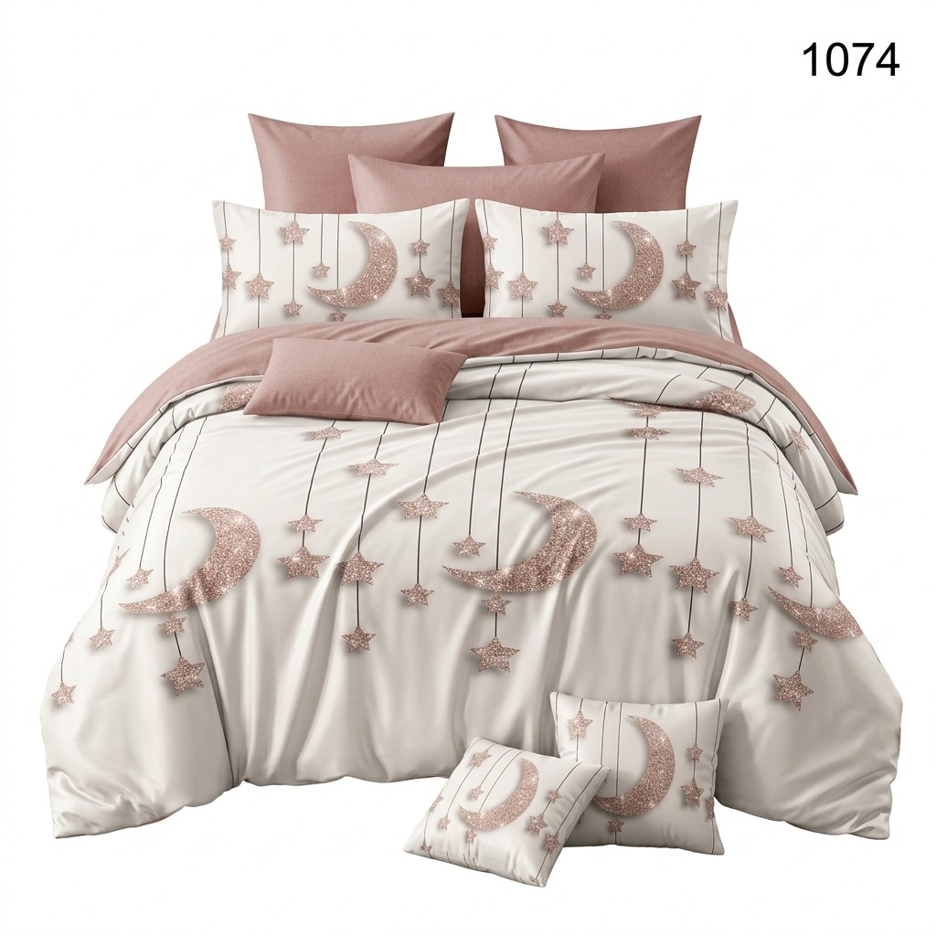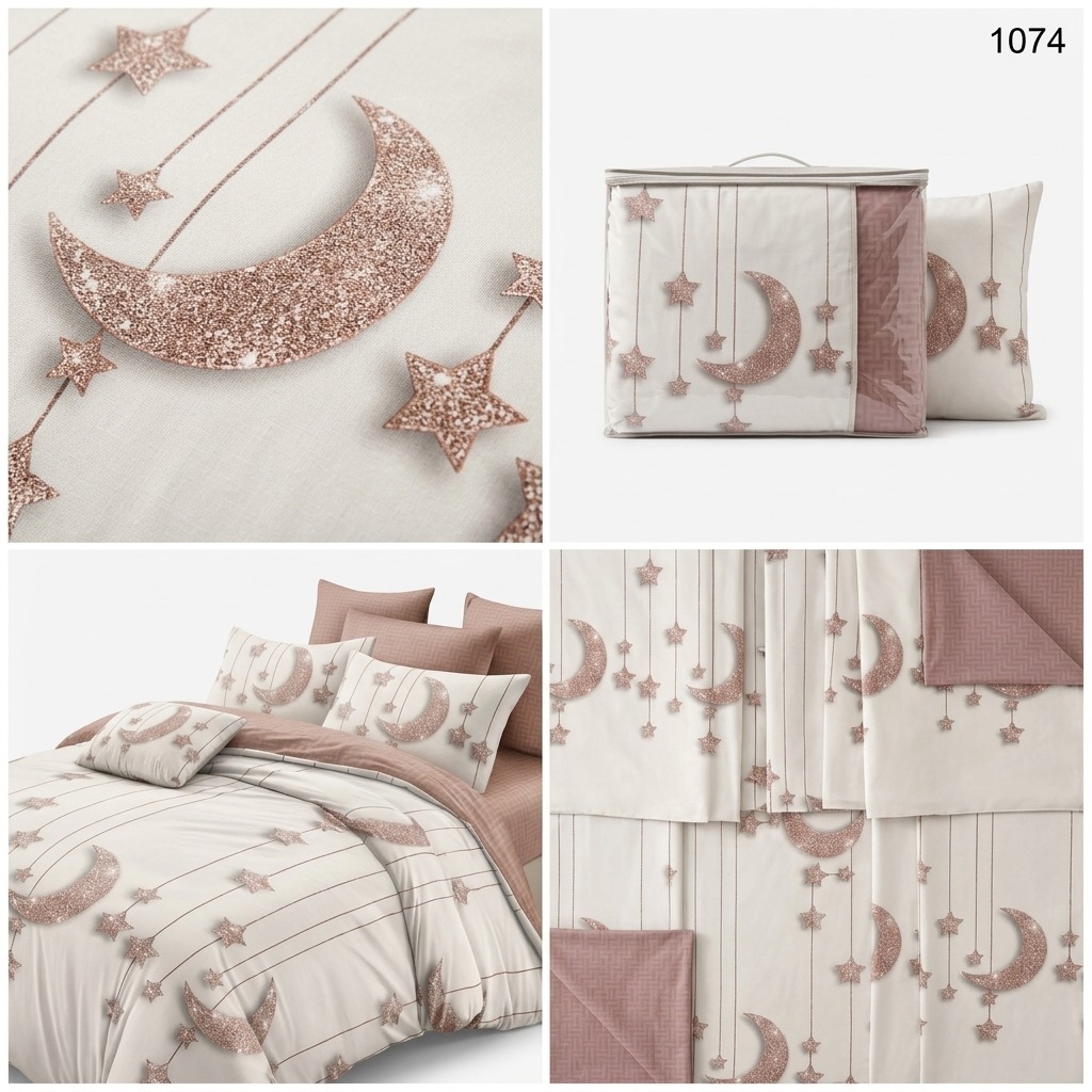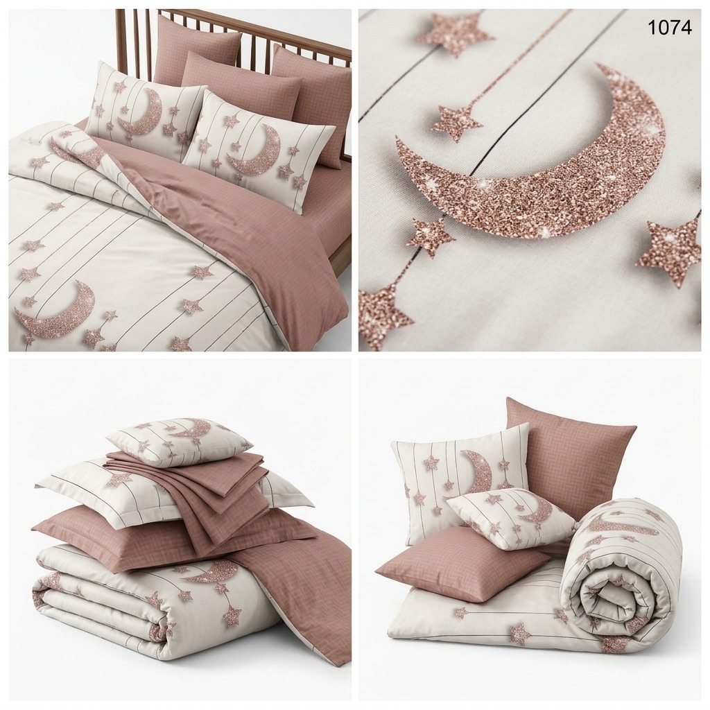 Estetica este dominată de un imprimeu cu lună și stele cu efect vizual de sclipici rose gold, suspendate pe un fundal luminos. Compoziția este echilibrată spectaculos de un cearșaf și fețe de pernă într-o nuanță caldă de roz prăfuit.