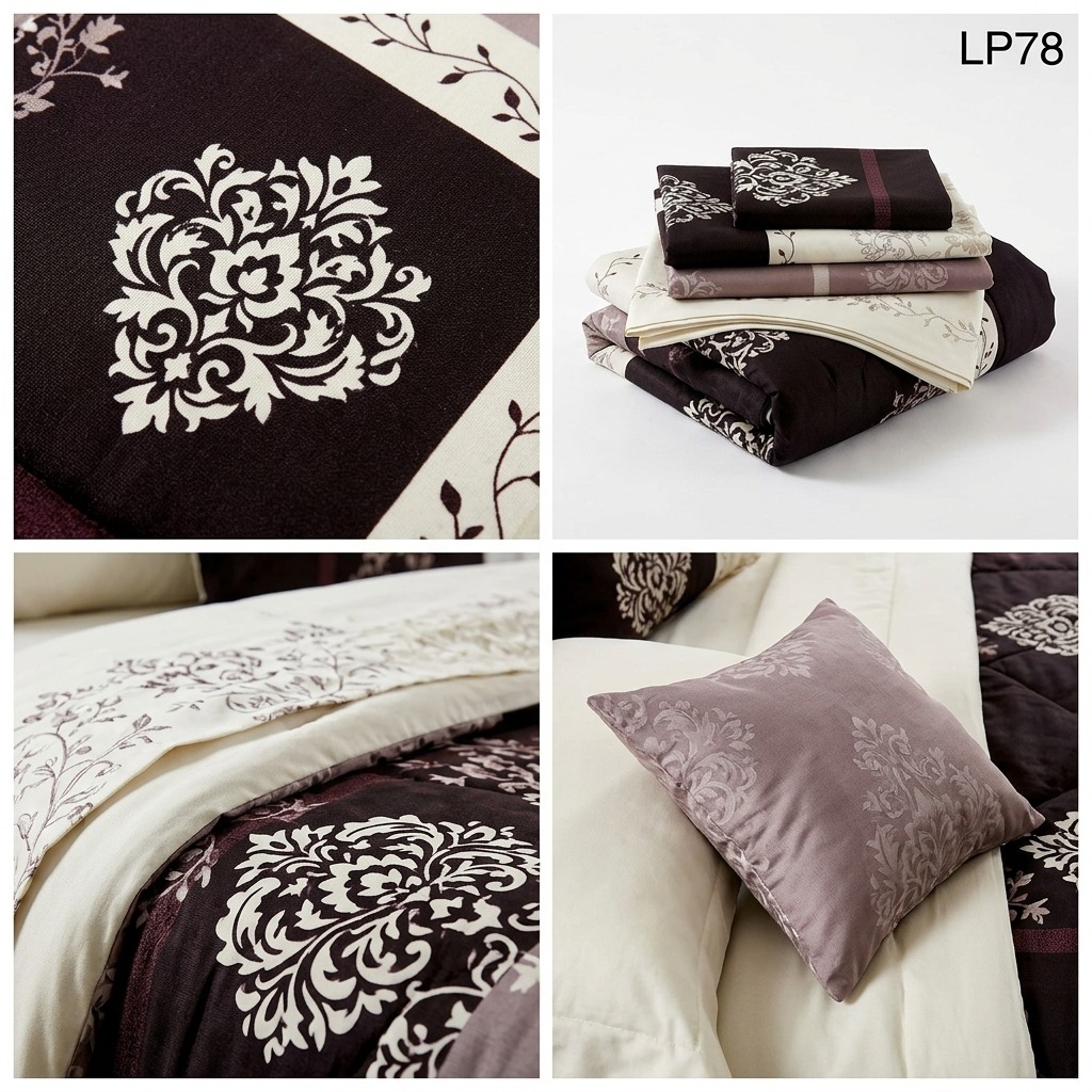 Estetica este dominată de un imprimeu impunător cu motive tip damasc în nuanțe de crem deschis, așezate pe un fundal maro închis intens. Această compoziție este echilibrată de un cearșaf de pat și fețe de pernă cu un model subtil, floral, perfect asortat.