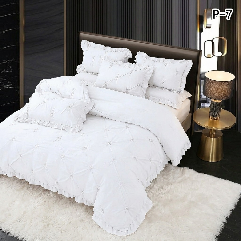 Adaugă un plus de eleganță dormitorului tău cu acest set de lenjerie de pat bumbac finet 6 piese, modelul PVP22. Decorată cu pliuri și volănașe discrete, aceasta oferă o textură catifelată și o durabilitate remarcabilă, fiind alegerea perfectă pentru un decor uni rafinat și un somn odihnitor.